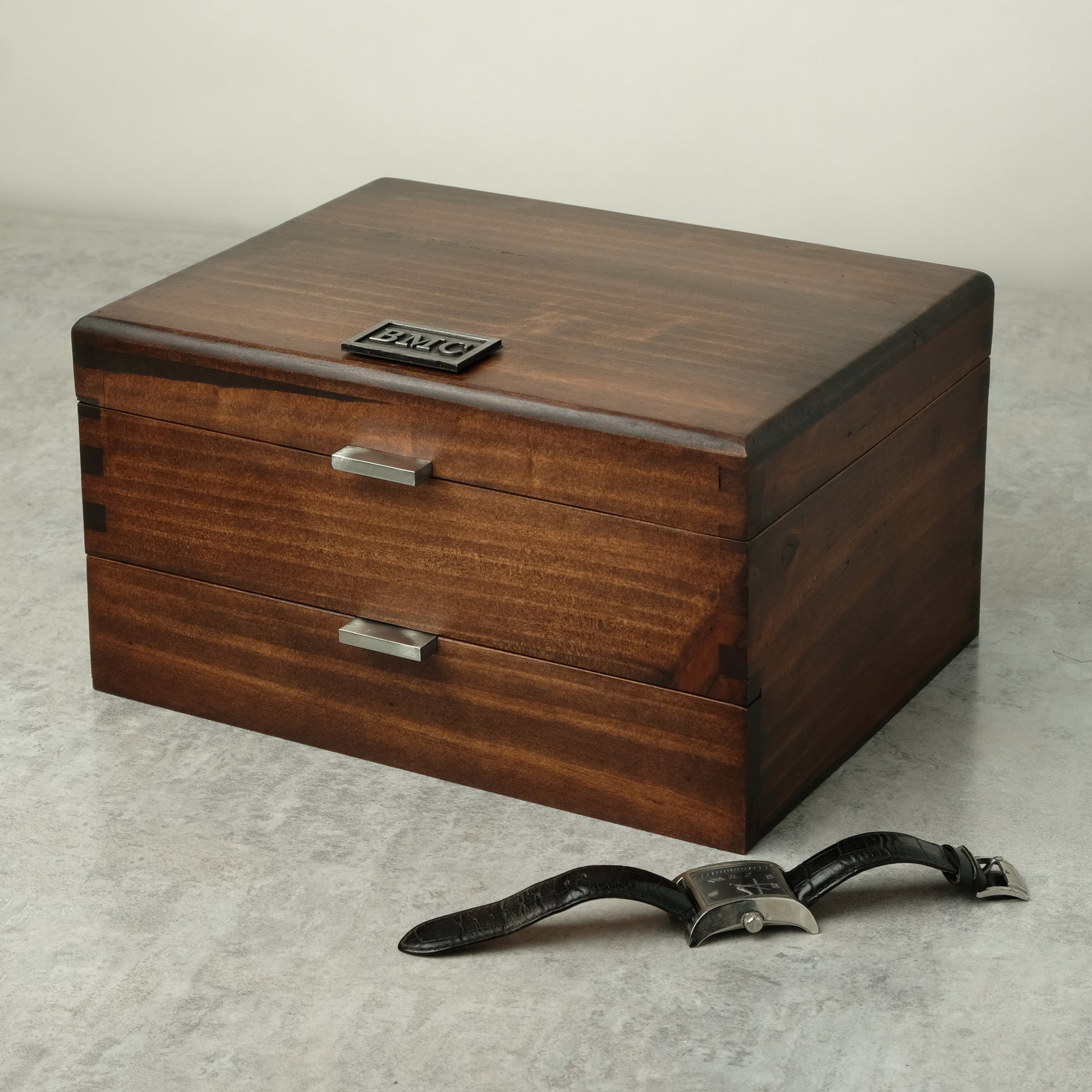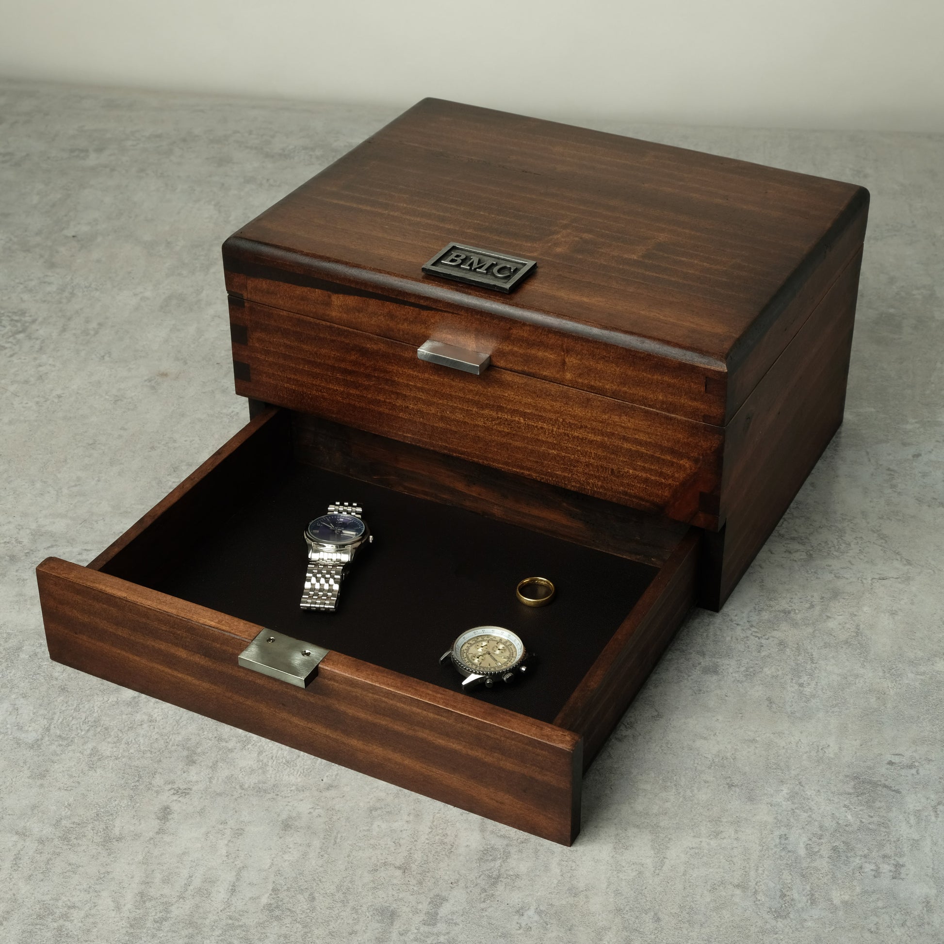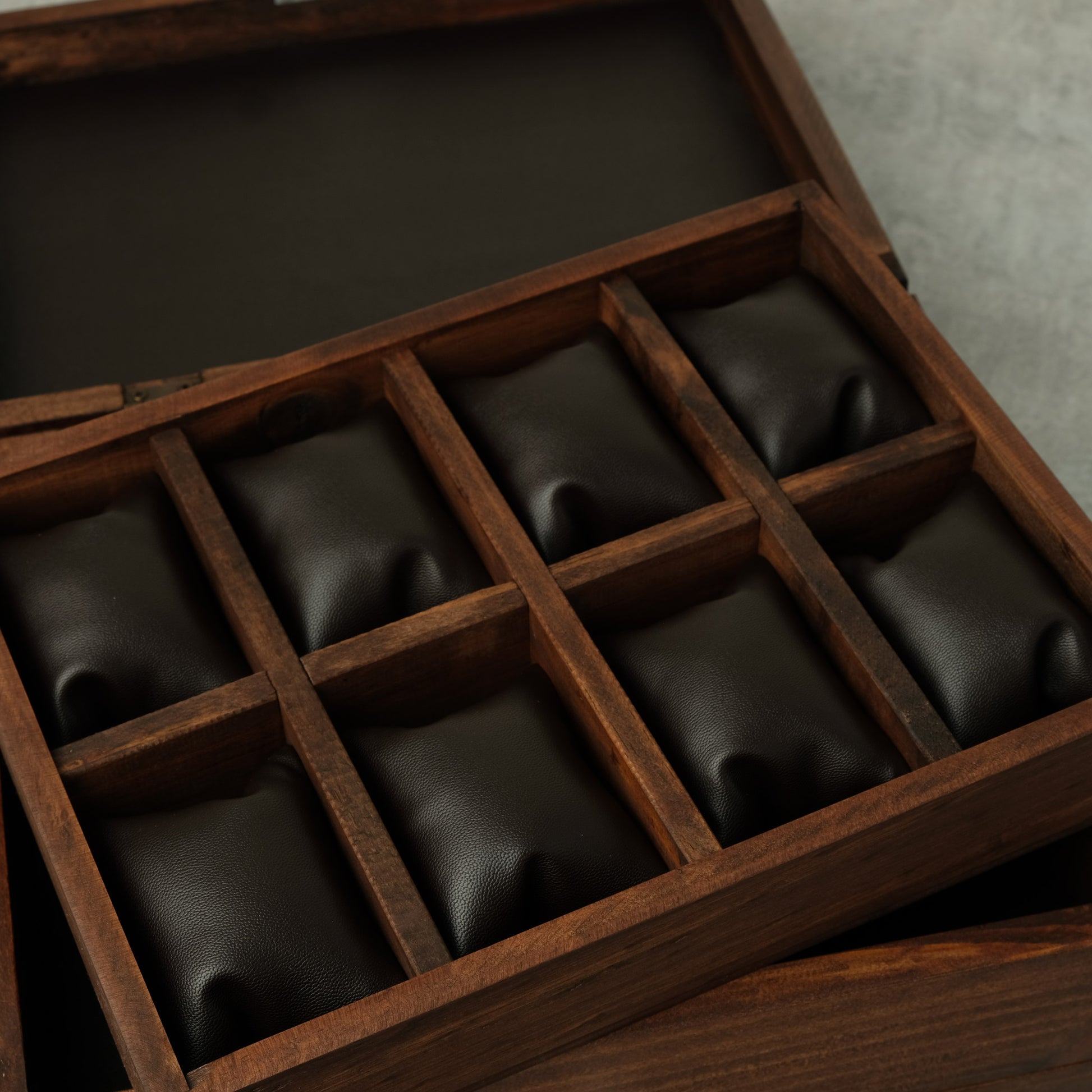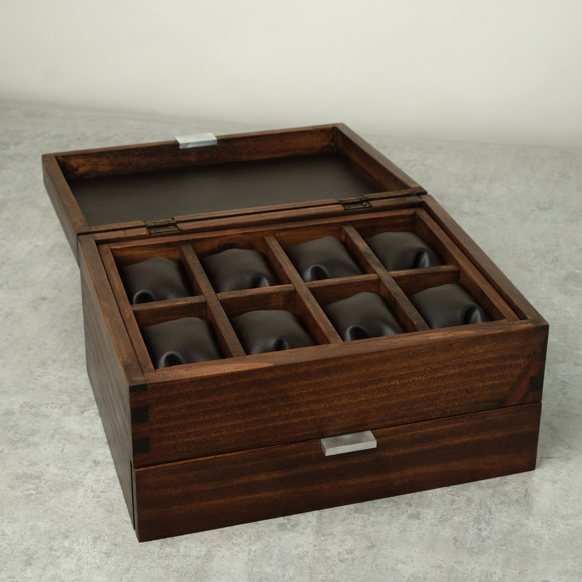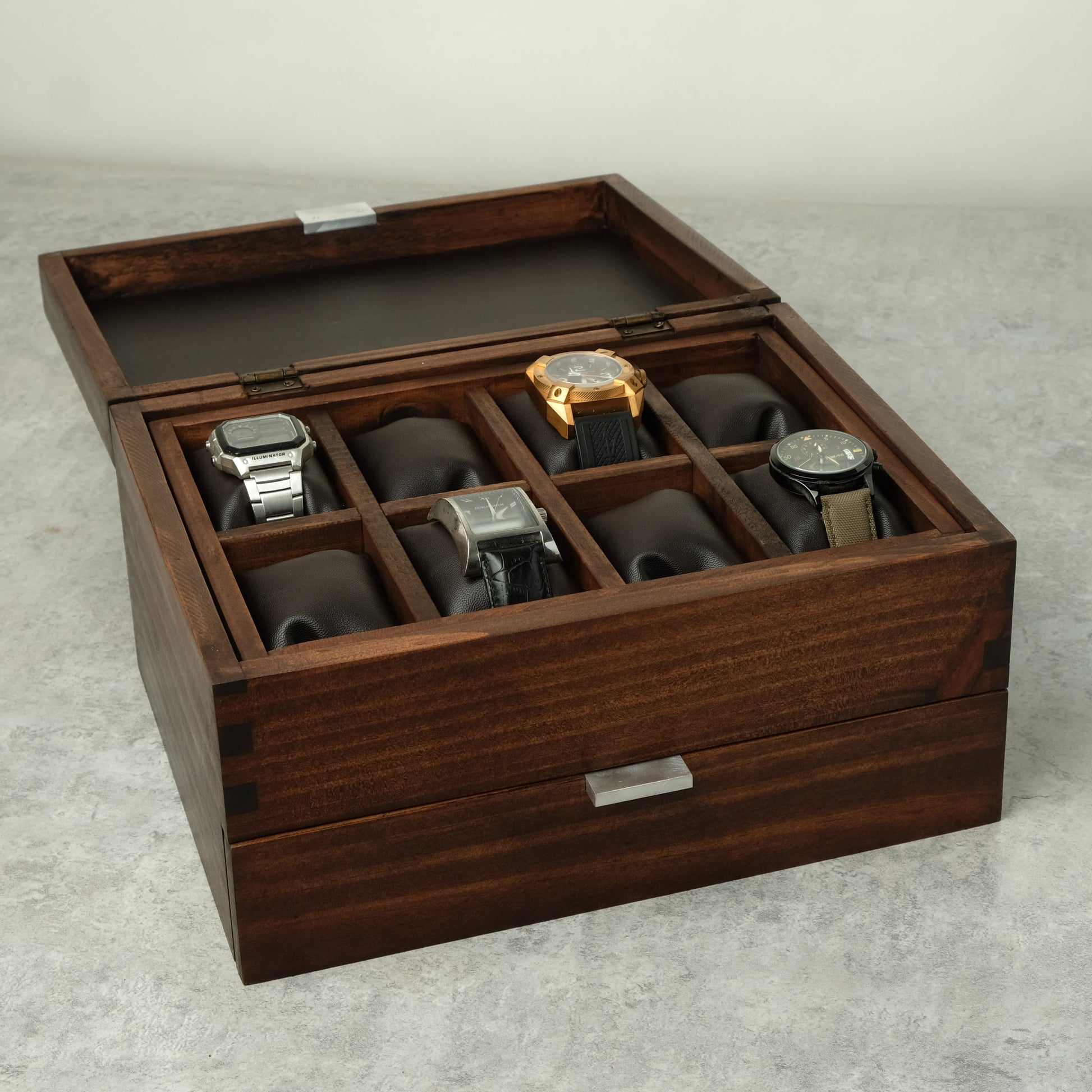 Protect and display your prized watches with our premium watch box in a sophisticated dark walnut finish. Featuring a removable tray and secure hardware, you can safely store up to 8 watches in style. Keep your collection organized and easily accessible with our modern watch box.