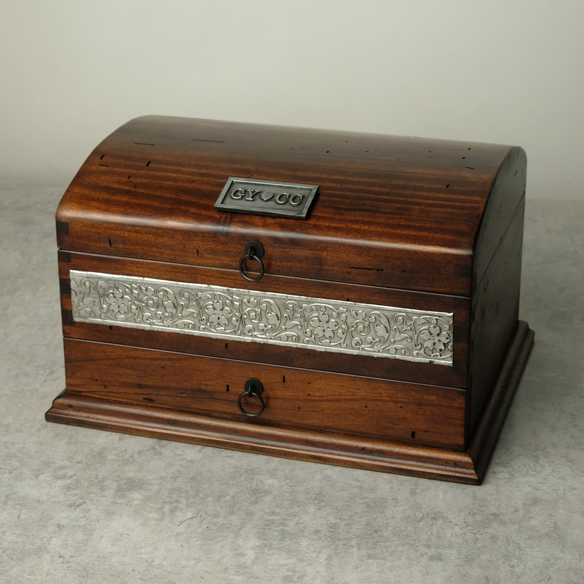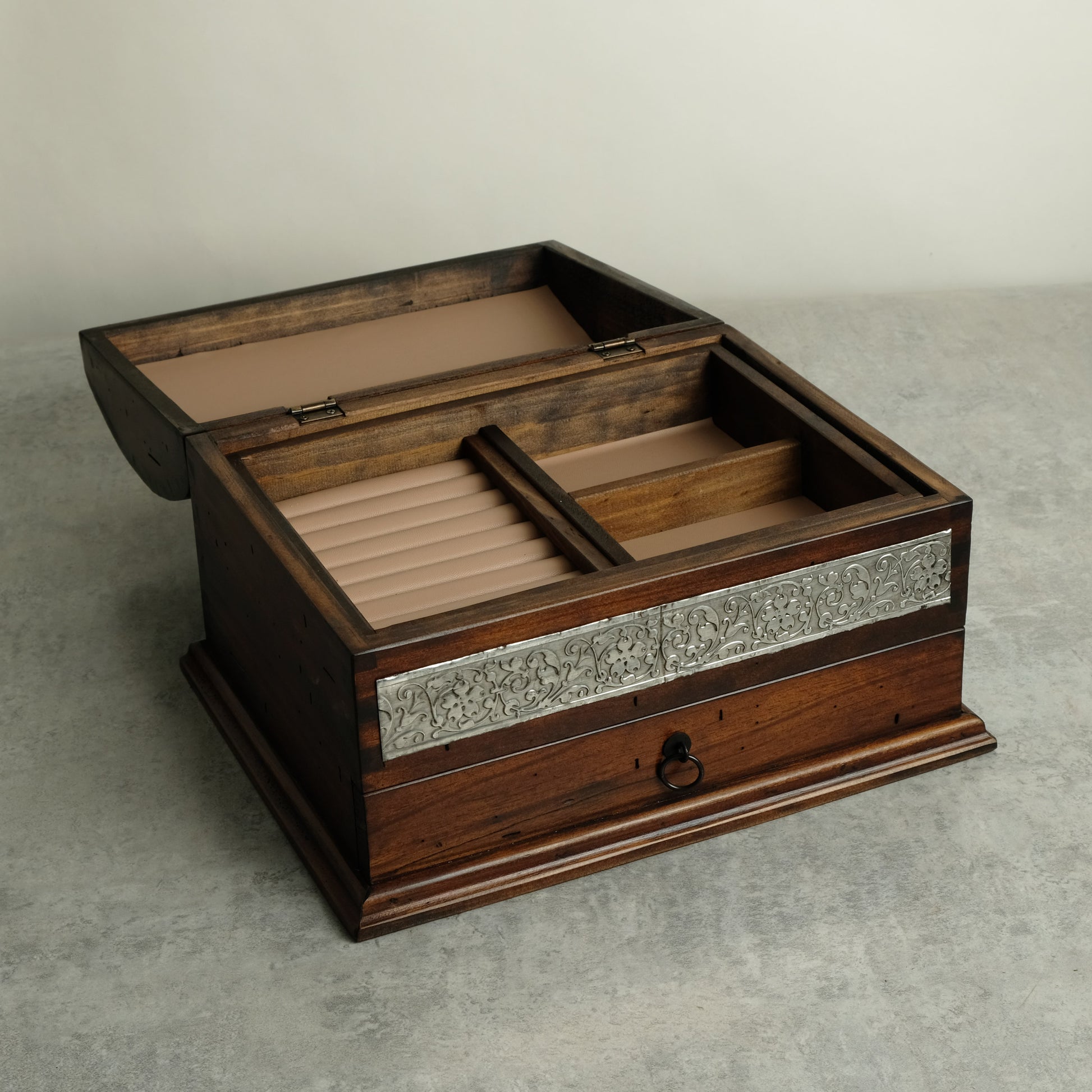 Crafted from rustic reclaimed wood, this curved top jewelry box combines timeless charm with personalized elegance. Designed to protect and organize your treasures, its unique weathered finish adds character to any space. Perfect for women who appreciate quality and individuality, this jewelry box not only stores your pieces securely but also enhances your dressing area with its warm, artisanal appeal. Make your collection truly special with a touch of bespoke craftsmanship.
